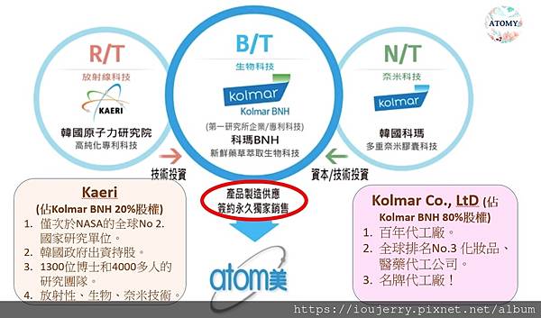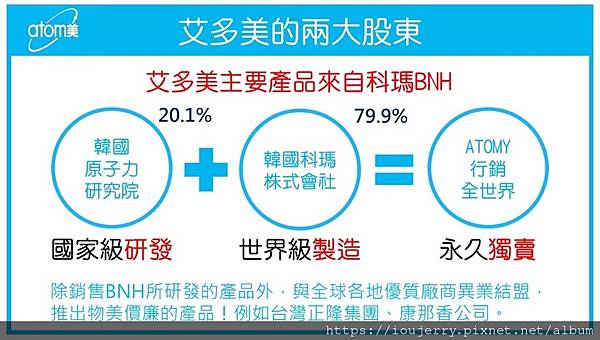 艾多美Atomy主要是專門銷售韓國科瑪BNH公司所研發的產品,雙方簽訂永久有效的銷售合約!那韓國科碼BNH是由韓國原子力研究院(相當於台灣的中研院)所以艾多美背後是有韓國政府資金投資的,以及和韓國科瑪公司合資設立的,專門生產由原子力研究院生命工學團隊研發的產品